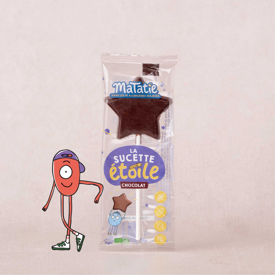 Sucette ludique et fondante au bon goût de chocolat, sans les 14 allergènes majeurs, et bio